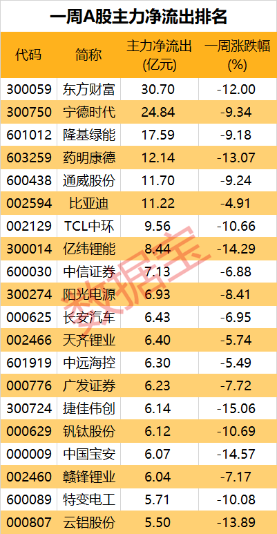 除去近一月上市新股,6股净流出额逾10亿元。东方财富一周主力净流出额居首,达30.7亿元。此外,新能源赛道股遭到主力集体抛售,宁德时代、隆基绿能、通威股份、比亚迪等行业龙头净流出额居前。