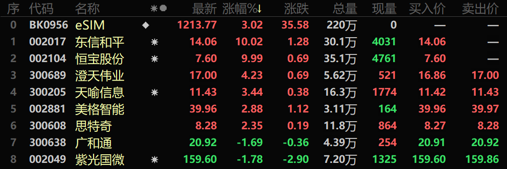 太平洋证券认为,eSIM将大幅降低物联网模组的制造成本和难度,提升模组厂商大规模出货能力,推动物联网应用发展。统计显示,A股中布局eSIM的有8只股票,昨天的交易日中,恒宝股份、东信和平强势涨停。恒宝股份的eSIM卡已实现批量供货。