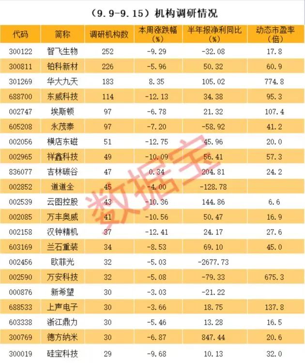 近一周机构调研个股数量有200多只,智飞生物成为调研机构数量最多的股票。
