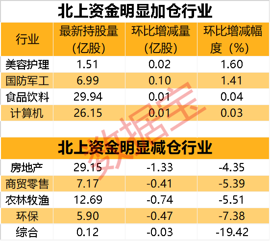 分行业来看,本周获北上资金加仓的行业仅4个,包括美容护理、国防军工、食品饮料、计算机行业,且加仓幅度较小。传统板块遭北上资金抛售,减仓板块中4个行业持股量降幅超过4%,降幅居前的包括环保、农林牧渔、商贸零售、房地产。