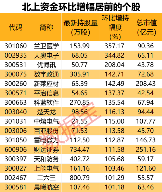 数据宝统计显示,增仓幅度来看,本周持股数环比增幅在100%以上的共有16只,环比增幅最大的是兰卫医学,北上资金最新持有153.99万股,持股数环比增长了357.17%。其次是天奥电子、优博讯、数字政通,环比增幅分别为344.82%、208.04%、142.71%。