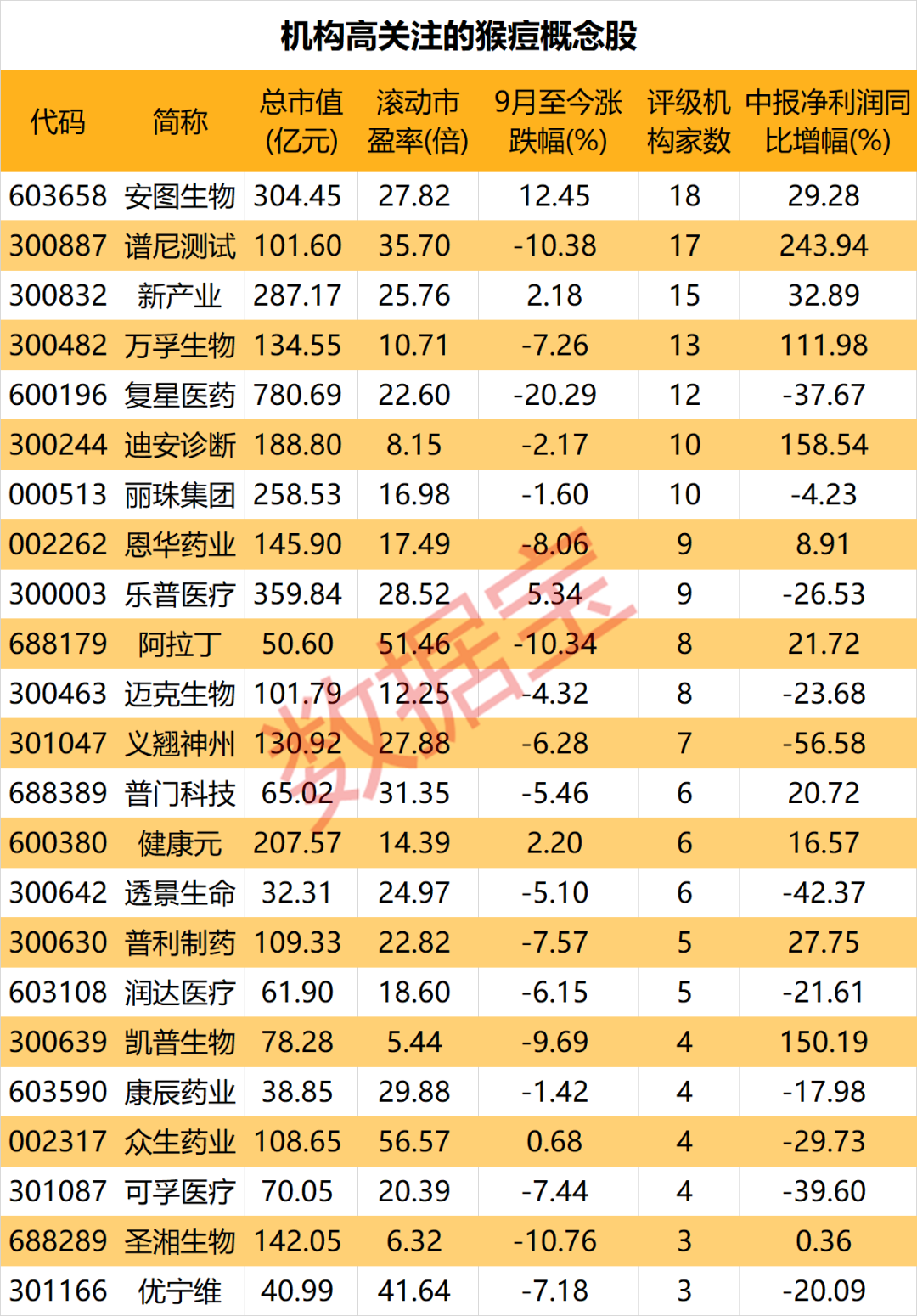 证券时报·数据宝统计,目前A股市场上具备猴痘相关业务的上市公司有40余家,其中3家及以上机构集中关注的共计23家。多数公司经营涉及检测业务,安图生物、新产业、复星医药、丽珠集团等旗下相关产品均已获得欧盟CE(CONFORMITE EUROPEENNE)认证准入。