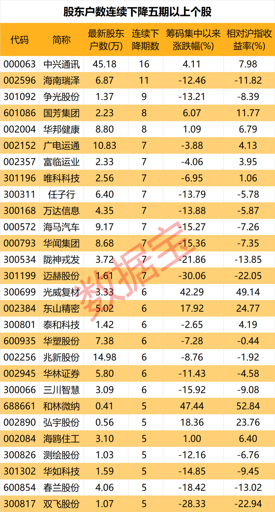 具体来看,ICT龙头中兴通讯连降期数居首,其股东户数已连降16期,累计降幅17.41%;第二位海南瑞泽股东户数连降11期,累计降幅20.66%。股东户数连降期数较多的还有争光股份、国芳集团、华邦健康等。