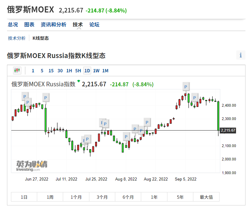 昨日晚间,俄罗斯股市突然闪崩,俄罗斯MOEX指数盘中一度大跌逾10%,跌破2200点,为8月9日以来的首次,收盘大跌8.84%。个股方面,俄罗斯天然气工业股份公司股价一度大跌14%。