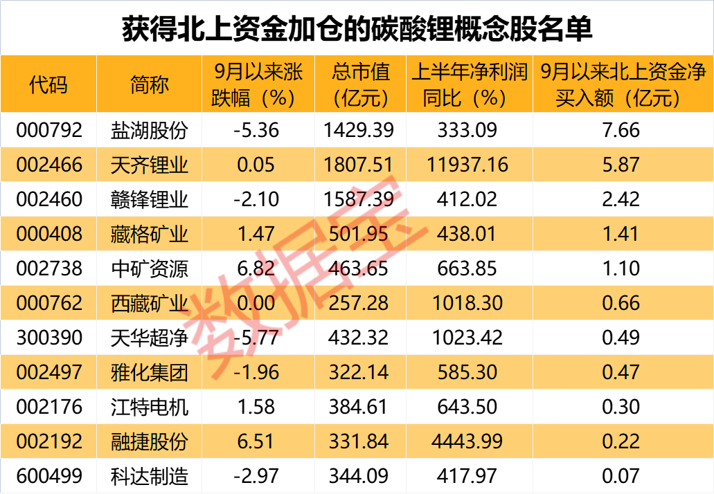 资金面来看,9月以来,11股获得北上资金加仓,盐湖股份、天齐锂业、赣锋锂业、藏格矿业、中矿资源均获得超亿元北上资金累计净买入。盐湖股份9月以来累计获得北上资金净买入7.66亿元,公司近日表示,已实现3万吨碳酸锂产能,自建 4万吨基础锂盐一体化项目已实施,计划2024年投产,盐湖比亚迪3万吨电池级碳酸锂项目在推进中。(数据宝 郭洁)