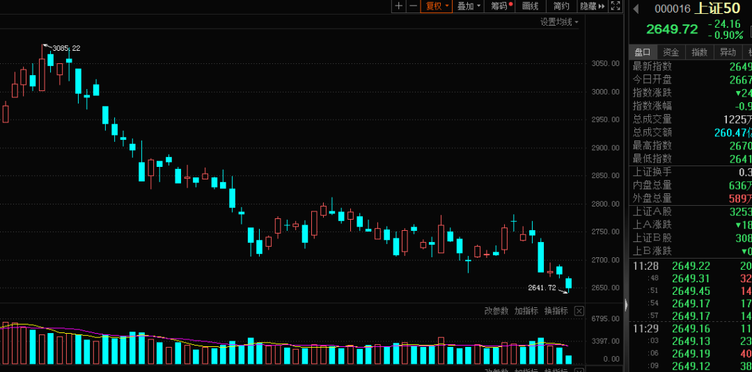 上证50指数也继续回调,最低下探至2641.72点,跌破5月份低点。大势调整下大盘蓝筹股也无法幸免,证券时报·数据宝统计,千亿市值股票中有15只个股年内跌幅超过40%,药明康德、伊利股份、海螺水泥等个股近期创出年内新低。