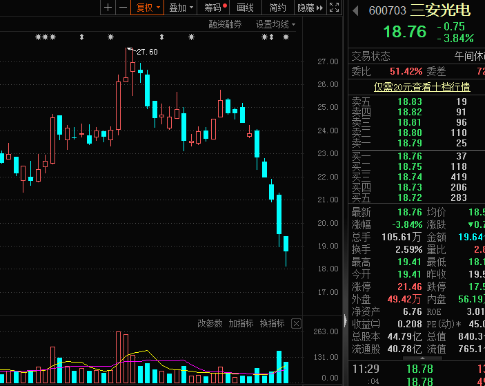 市场情绪面依然偏谨慎。LED芯片龙头三安光电早盘继续下跌,盘中一度跌超7%。昨日盘中有用户在网络平台发帖称,三安光电有相关人士中午在办公室被带走。此外,坊间还有关于“机构认为当前参与公司定增的价格太贵”的声音传出。昨日晚间三安光电发布澄清公告称,“三安光电有相关人士中午在办公室被带走”报道不属实。