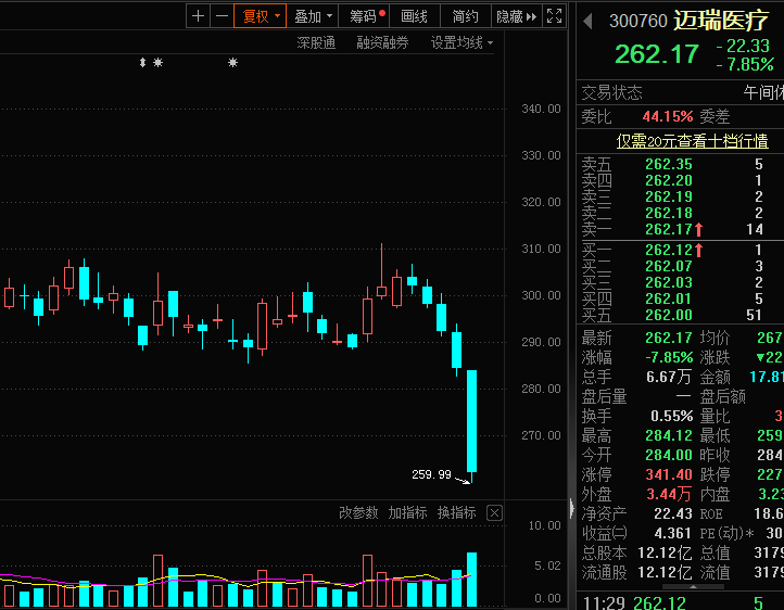 除了三安光电,今天早盘还有多只大白马继续杀跌。其中,医疗设备龙头迈瑞医疗一度大跌逾8%,创出本轮调整新低。芯片龙头韦尔股份一度跌逾5%,创出本轮调整新低,歌尔股份、东方雨虹等个股盘中大跌逾4%。