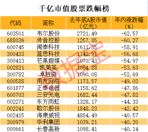 韦尔股份并不是唯一一只年内跌幅超过60%的千亿市值股票。传音控股年内跌幅超过60%,位居千亿市值股票跌幅榜次席。此外,闻泰科技、蓝思科技、芒果超媒、凯莱英、卓胜微等千亿市值股票均跌超50%。跌幅榜第11位的是东方雨虹,年内跌幅超过44%。这意味着年内股价跌幅超过44%的东方雨虹,排不进千亿市值股票跌幅榜前十。