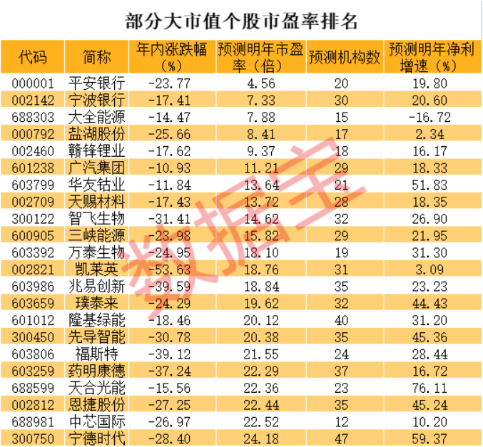 数据宝统计,调高业绩预期机构数超过调低机构数5家以上的个股中,有22只个股机构预测明年市盈率在30倍以下且年内跌幅超过10%。从估值角度看,平安银行、宁波银行、大全能源、盐湖股份、赣锋锂业等个股机构一致预测明年市盈率均在10倍以下。(数据宝 陈见南)