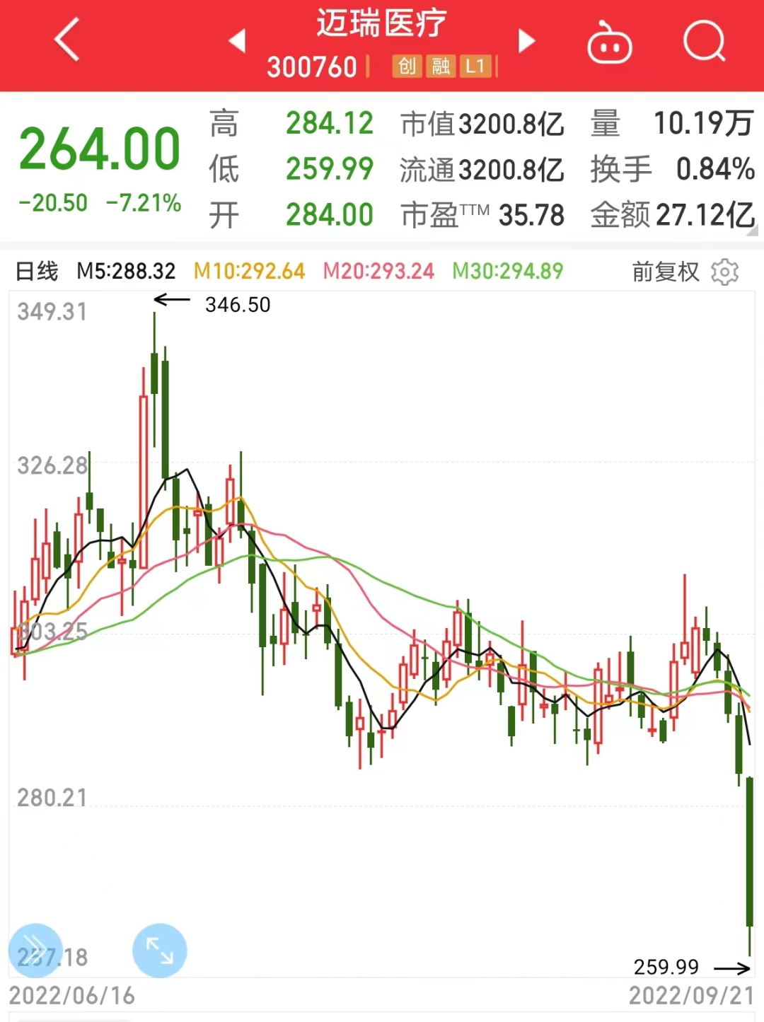创业板指成份股中,迈瑞医疗跌幅最大,该股低开后持续走弱,收盘跌7.21%,最新收盘价创两年来新低,A股市值跌至3200亿元附近。目前,公司A股市值仍排在医药生物行业第一位。