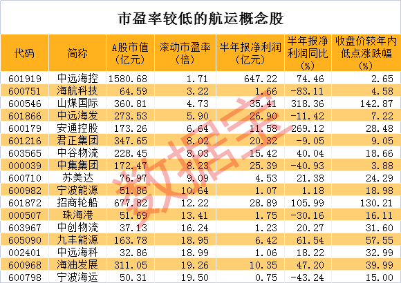 证券时报·数据宝统计,9月以来航运概念股中,8股累计涨幅超过10%。招商南油、中远海能累计涨幅超30%,与年内低点相比,2股最大涨幅超过2倍。截至9月21日,航运概念股市盈率低于20倍的超半数。中远海控、海航科技、山煤国际等滚动市盈率不足5倍。