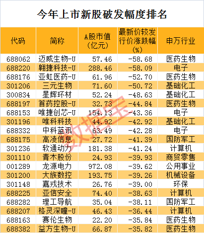 与发行价相比,破发幅度超过50%的有4只股票,分别是迈威生物-U、翱捷科技-U、亚虹医药-U、三元生物。迈威生物-U最新收盘价较发行价跌幅58.68%,破发幅度最高。该公司主业为疗用生物制品的研发、生产与销售,今年1月份上市首日即跌破发行价。今年上半年公司净利润亏损4.23亿元,亏损金额比公司同期营收高出数十倍。