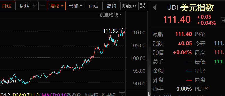 与此相反,美元指数盘中再创2002年以来新高,盘中最高报111.4025,涨幅超1%。