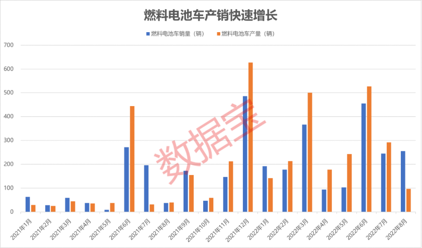 燃料电池汽车销量持续高增。根据乘联会数据,8月,燃料电池汽车产销分别完成97辆和255辆,同比分别增长1.4倍和5.7倍。1-8月,燃料电池汽车产销均完成0.2万辆,同比分别增长2倍和1.6倍。