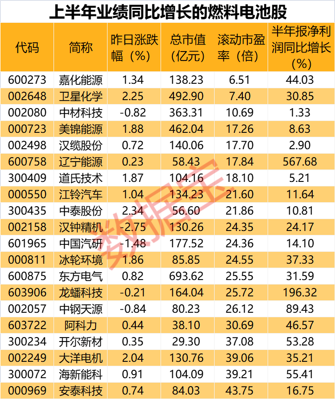 证券时报·数据宝统计显示,A股中布局氢燃料电池的概念股共有63只,昨日有50股实现上涨,中通客车实现涨停,富瑞特装、金龙汽车、厚普股份涨幅居前。业绩上来看,20只燃料电池概念股上半年归母净利润同比增长,包括嘉化能源、卫星化学、中材科技等。
