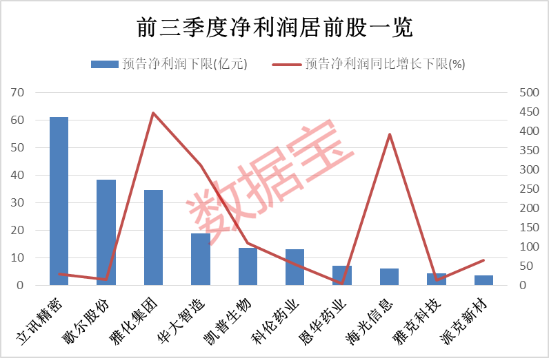 按照预告下限数据来看,立讯精密、歌尔股份、雅化集团等6股预告前三季度归母净利润额超过10亿元。立讯精密预测前三季度净利润约60.97亿元至65.66亿元,变动幅度为30%至40%。本周以来,立讯精密获得北上资金青睐,累计净买入额超3亿元。