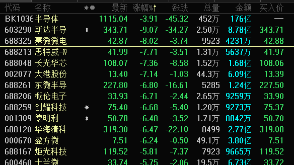 早盘半导体概念整体下挫,板块合计主力净流出金额超过8亿元,半导体硅片、材料、设备指数跌幅均超过3%。板块仅三股小幅上涨,包括臻镭科技、利扬芯片、卓胜微,分别微涨1.56%、0.73%、0.21%。