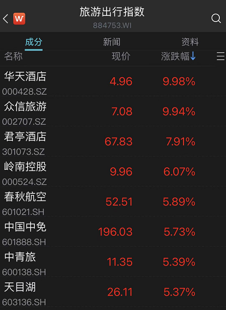 受即将到来的国庆长假催化,今日旅游休闲、机场、航空等相关板块表现亮眼,华天酒店涨停,君亭酒店、众信旅游、春秋航空等涨超5%。