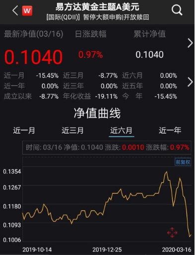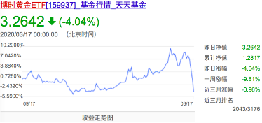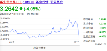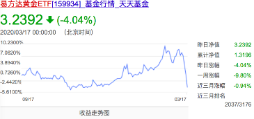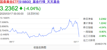 国内4只黄金ETF产品也随之大跌,近一周内,华安易富黄金ETF、易方达黄金ETF、博时黄金ETF、国泰黄金ETF分别跌了9.82%,9.80%,9.81%和9.80%。