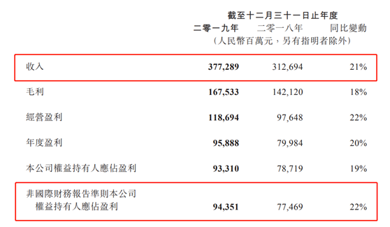 2019年全年营收高达3773亿元,同比增长21%,年度盈利958.88亿元,同比增长20%,非通用会计准则下,归母净利润为943.51亿元。