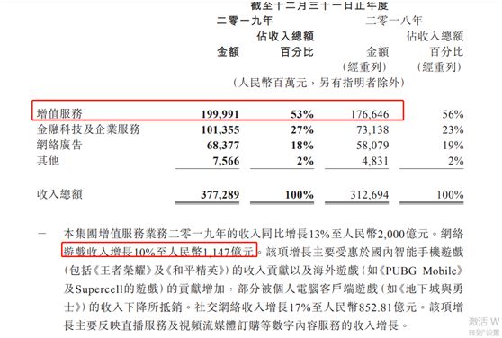 截至2019年底,增值服务同比增长13%至2000亿元,占总营收53%。其中网络游戏收入增长10%至1147亿元,而该项增长主要受惠于国内智能手机游戏(包括《王者荣耀》,《和平精英》)的收入贡献以及海外游戏(如《Public Mobile》及Supercell的游戏)的贡献增加。社交网络收入增长17%至852.81亿元,腾讯财报表示该项增长主要反映直播服务及视频流媒体订购等数字内容服务的收入增长。