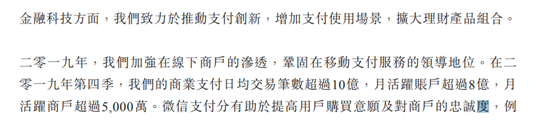 而在金融科技方面,2019年财报显示,在2019年第四季度,腾讯商业支付日均交易笔数超过10亿,月活跃账户超过8亿,月活跃商户超过5000万,随着腾讯扩大在大众市场的业务,腾讯理财平台理财通的资产保有量同比增长超过50%,而客户数目同比增长超过1倍,联营公司微众银行在微信内提供小额贷款产品“微粒贷”,该产品贷款余额迅速增长,不良贷款比例维持较低水平。