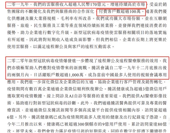 财报指出,新型冠状病毒疫情暴发进一步体现了远程办公及远程医疗服务的效用。其中,腾讯会议自2019年12月底推出后的两个月内,日活跃账户数超过1000万,成为当前中国最多人使用的视频会议专用应用之一。