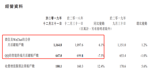 作为腾讯的两款拳头产品,微信及WeChat合并月活跃账户数大11.6亿,同比增长6.1%,然而QQ月活人数却出现下滑,QQ智能终端月活跃用户数6.47亿,同比下降7.5%。
