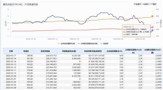 近期国际股市虽然剧烈震荡,腾讯股价随之调整下挫,从沪港通资金数据来看,腾讯成为许多南下资金避险的选择。实际上,从2019年12月31日的沪深港通持股比例来看,当时这个数字是1.89%,而截至2020年3月17日,沪深港通持股比例上升至2.45%,按照腾讯3月18日收市的334港元/股计算,这部分股份市值大约为187亿港元。南下资金的持续买入,也在一定程度上反映内资对于腾讯公司基本面和未来前景的看好。