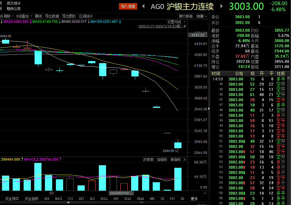 国际银价的崩盘很快传导至国内市场。周一,上期所白银主力合约以跌停价收盘;周二开盘则一字跌停直到收盘,两日共跌去了15%,价格从3791元跌至3211元;周三,继续大跌6.38%,盘中跌破3000元,三个交易日跌去20%。
