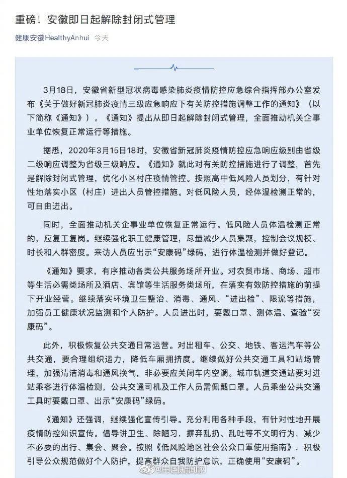 18日,安徽发布《通知》提出从即日起解除封闭式管理,对低风险人员,经体温检测正常的,可自由进出。此外,恢复公共交通日常运营。对出租车、公交、地铁、客运汽车等公共交通,要合理组织运力,降低车厢拥挤度。据悉,15日18时,安徽省新冠肺炎疫情防控应急响应级别由省级二级响应调整为省级三级响应。