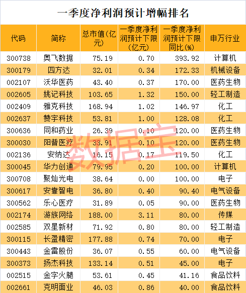 从净利润预计增幅来看,11股一季度净利润有望翻倍增长。奥飞数据净利润预计增幅排名第一位。四方达预计增幅排在其次,公司预计一季度净利润为0.34亿元至0.37亿元,同比增长172.33%至200.78%。沃华医药净利润预计增幅紧随其后,净利润预计翻倍的还有姚记科技、雅克科技、赞宇科技、同和药业、阳普医疗等。