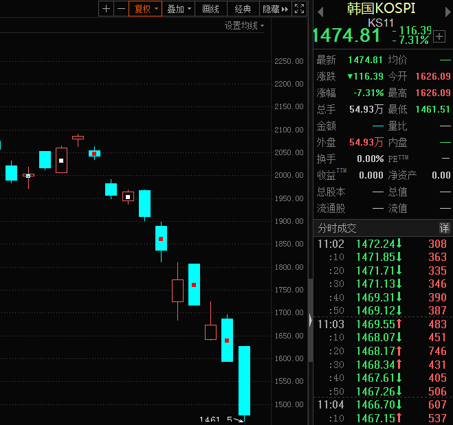 韩国KOSPI指数早盘是暴跌,盘中跌幅超8%,触及熔断交易暂停。
