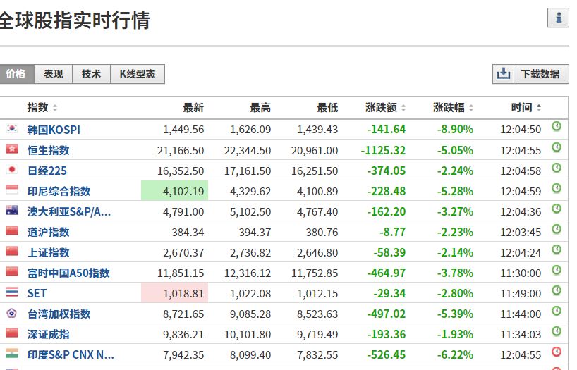 印尼雅加达综合指数下跌5%,触发交易限制;印度孟买SENSEX指数跌幅超6%;澳大利亚普通股指数跌幅超3%。恒生指数早盘暴跌上千点,跌幅一度跌超4%,不过,截至11点35分,恒指也开始回拉。台湾加权指数盘中跌幅一度超7%。