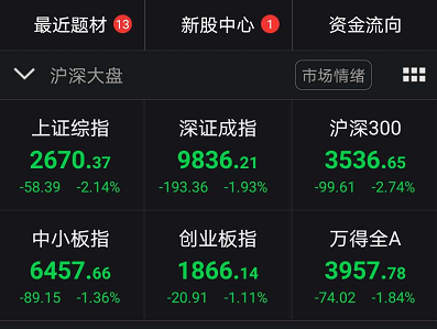 上证指数早盘一度跌超3%,午间收盘前跌幅收窄。截至午间收盘,沪指跌2.1%,报收2670点;深成指跌1.9%,报收9836点;创业板指跌1.1%,报收1866点。白酒、民航机场、保险等行业跌幅靠前。沪股通净流出30.41亿,深股通净流出14.86亿。