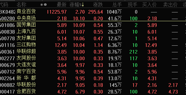 受沃尔玛逆市新高影响,今日A股商业零售股票掀起涨停潮,中央商场、国芳集团、上海九百等10只股票涨停。