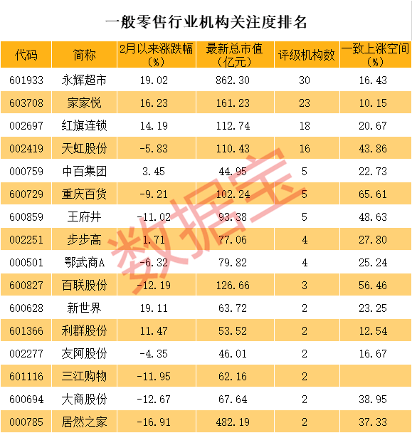 永辉超市、家家悦、红旗连锁、天虹股份等个股机构关注度居前,具有10家以上机构关注。天虹股份一致目标涨幅最高,接近44%。