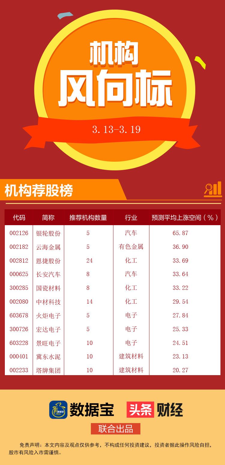 数据宝统计显示,近一周机构给出目标价不少于2家的个股中,将公布的目标价与最新收盘价相比,银轮股份、云海金属、恩捷股份、国瓷材料等11股机构预测上涨空间均超20%。