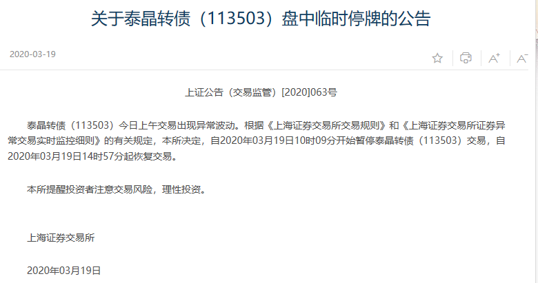 3月19日,泰晶转债盘初涨20%,被临时停牌半小时。恢复交易后迅速拉升,涨超30%,被第二次临时停牌。上交所公告称,自2020年03月19日10时09分开始暂停泰晶转债交易,自2020年03月19日14时57分起恢复交易。临停前,泰晶转债涨32.14%。