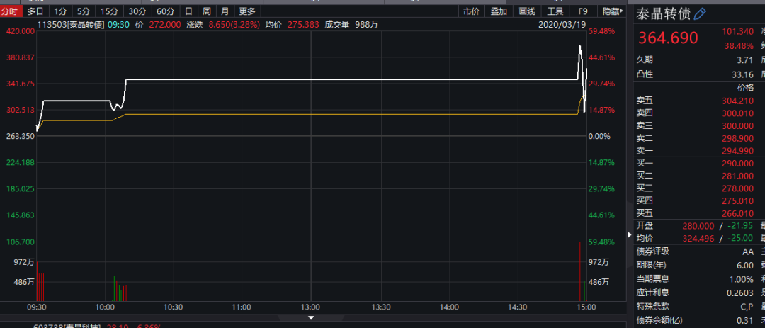 14时57分恢复交易后,泰晶转债快速拉升至51.51%,之后出现回调,截至收盘报364.69元/张,仍大涨38.48%。