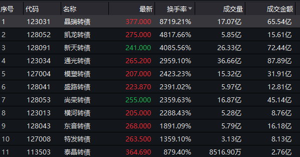 此外,凯龙转债、新天转债换手率分别高达4817.66%和4085.16%。通光转债、模塑转债、盛路转债尚荣转债及横河转债换手率在20倍以上。东音转债、特发转债也在1000%以上。
