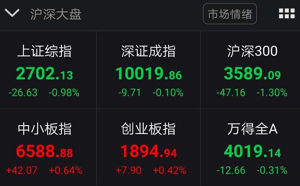 截至收盘,上证综指报收2702.13,收跌0.98%。深证成指报收10019.86,微跌0.10%。创业板指报收1894.94,报收0.42%。