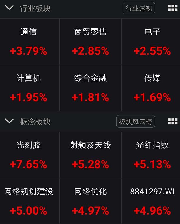 随后,通信、电子、计算机等新基建板块先后反弹,最大涨幅超3%左右。同时,光刻胶、网络规划建设、射频及天线等概念题材涨幅居前。
