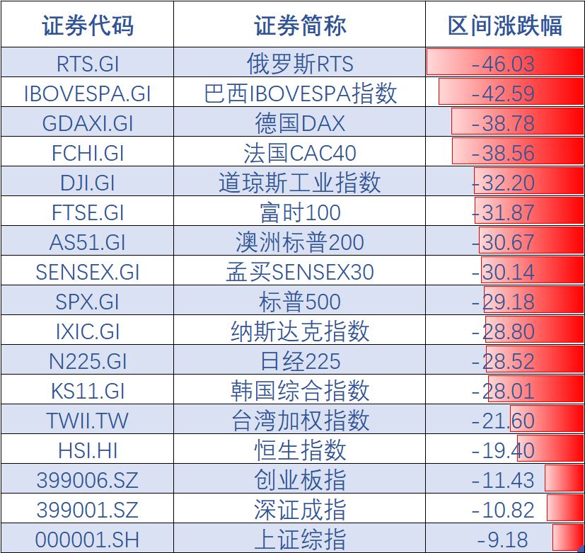 而跌幅最大的俄罗斯股市指数已经接近腰斩。恒生指数跌超19%;道指跌超32%;而德国、法国跌幅均高达38%以上。