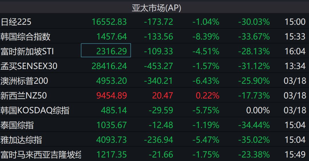不过,亚太股市方面,多国股市全线重挫,其中韩国股市大跌8%以上,盘中一度触发熔断,澳洲、印尼、新加坡等国主要指数跌超4%以上。