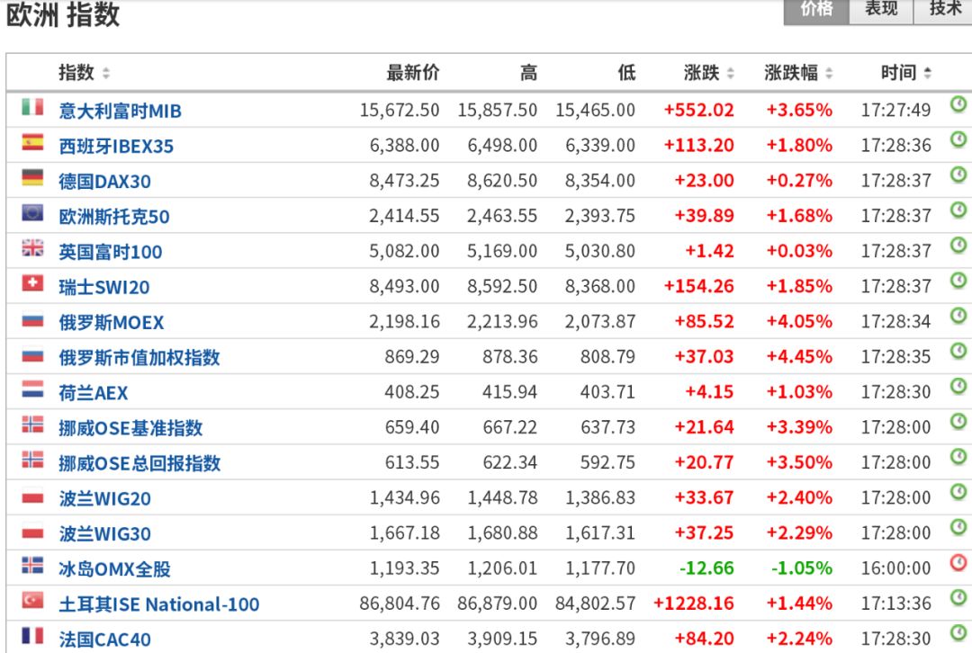 截至下午5点30分左右,意大利富时MIB指数涨超3%以上,欧洲斯托克50指数期货跌幅超1%,法国CAC 40指数涨2.24%;德国 DAX 30指数微涨0.27%。