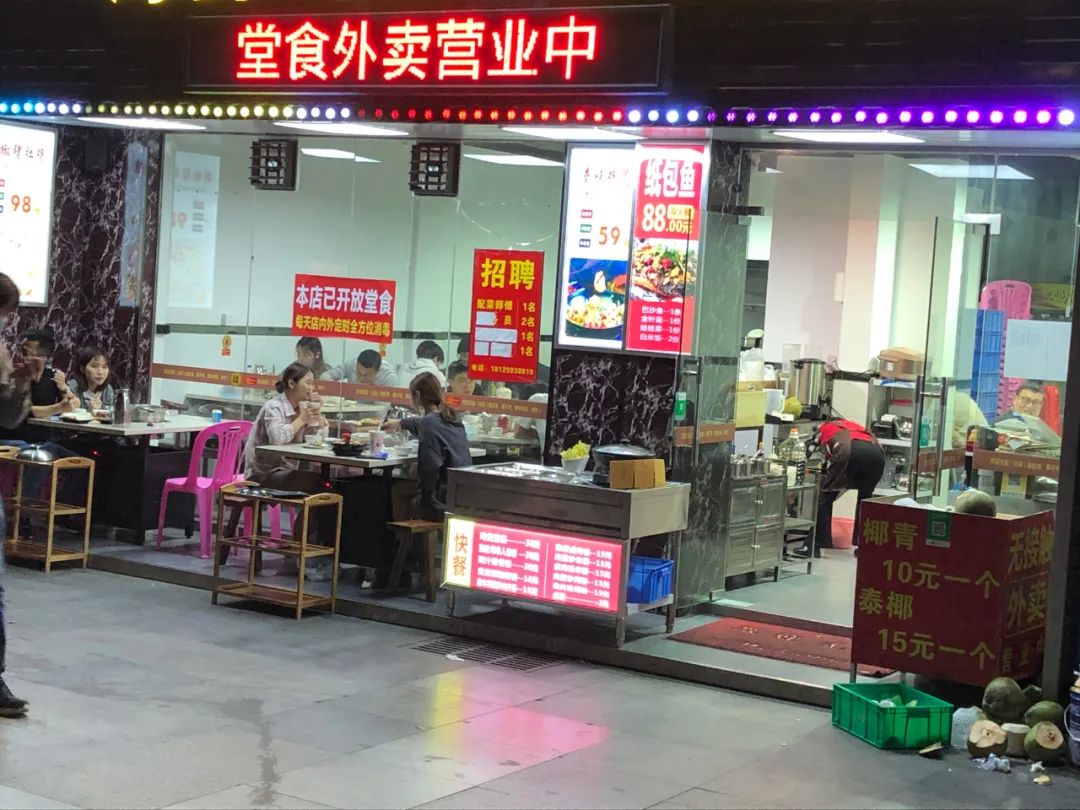 多家餐饮店店员告诉记者,他们只在周六日进行堂食打折,非堂食还是原价,目的是为了吸引堂食的人气,平时工作日还是以线上外卖为主。然而,外卖对他们来说,杯水车薪。“平时我们每天至少要有1.5万的营业额,才可能达到收支平衡,可是这两个月,每天的外卖才几千块,连发工资都很勉强。”一家川菜馆店员告诉记者。