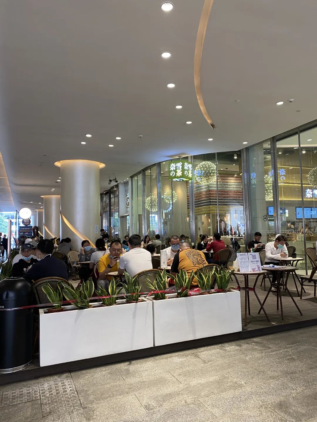 新茶饮店喜茶和奈雪同样不逊。记者在上述购物中心的奈雪门店看到,店内座位基本被坐满,每桌坐2人,服务台还有人排队点餐。而位于卓越汇的奈雪店,也同样客流量大,该店下单全部通过小程序,休息区也坐满了顾客。此外,记者在喜茶门店看到,店内和门口同样坐满了顾客,消费者也只能通过小程序下单,登记信息测完体温才能进入店内。