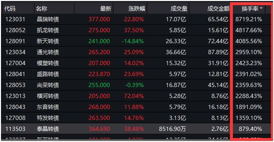 此外,从换手率看,有10只可转债超过了1000%,最高的晶瑞转债甚至达到8719.21%。